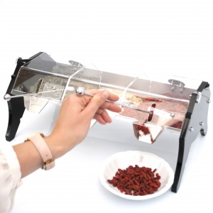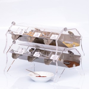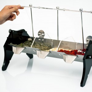 Tiretto è un dispenser per semi e cereali, la cui caratteristica principale è quella di condensare, in poco spazio, molte varietà di prodotti. Ogni Tiretto ha 3 scomparti per alimenti e attraverso un rastrello manuale, l'operatore sceglie il prodotto e la quantità da lui richiesta. Grazie alla sua forma, Tiretto può essere impilato per ottimizzare lo spazio del buffet. Un coperchio in plexiglass permette di evitare il contatto diretto con gli alimenti, mentre per il ricaricamento è sufficiente svitare le due viti di battuta laterali.